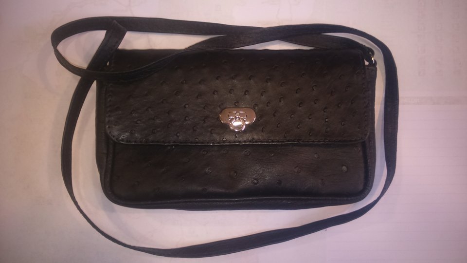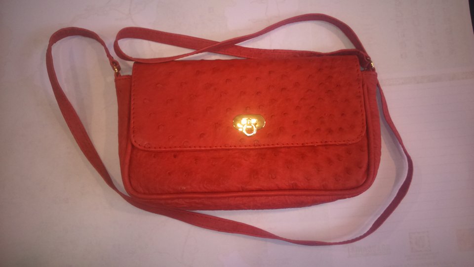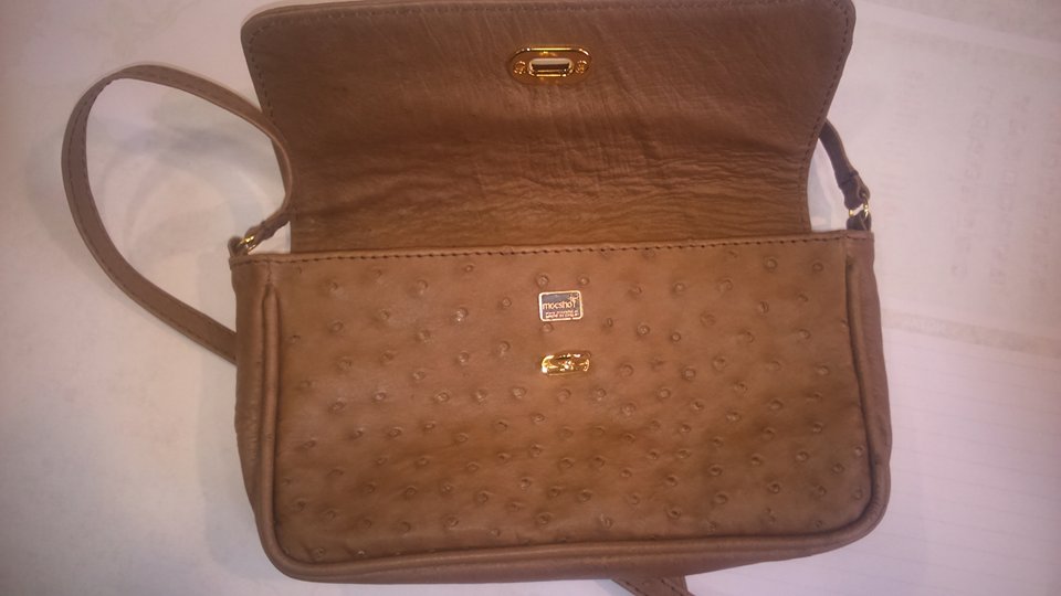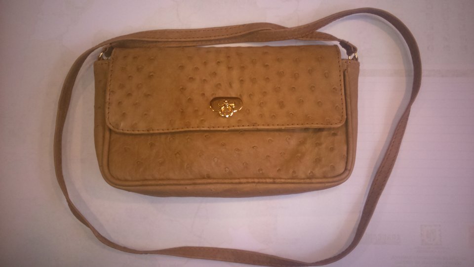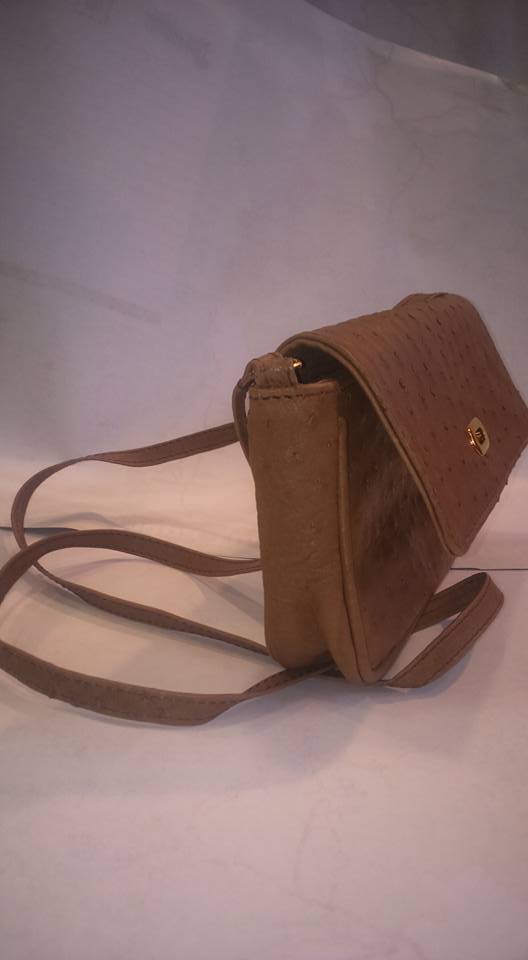 Avestruz piel, cartera small con bandolera y broche seguridad. 12*21*4 cm