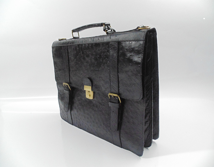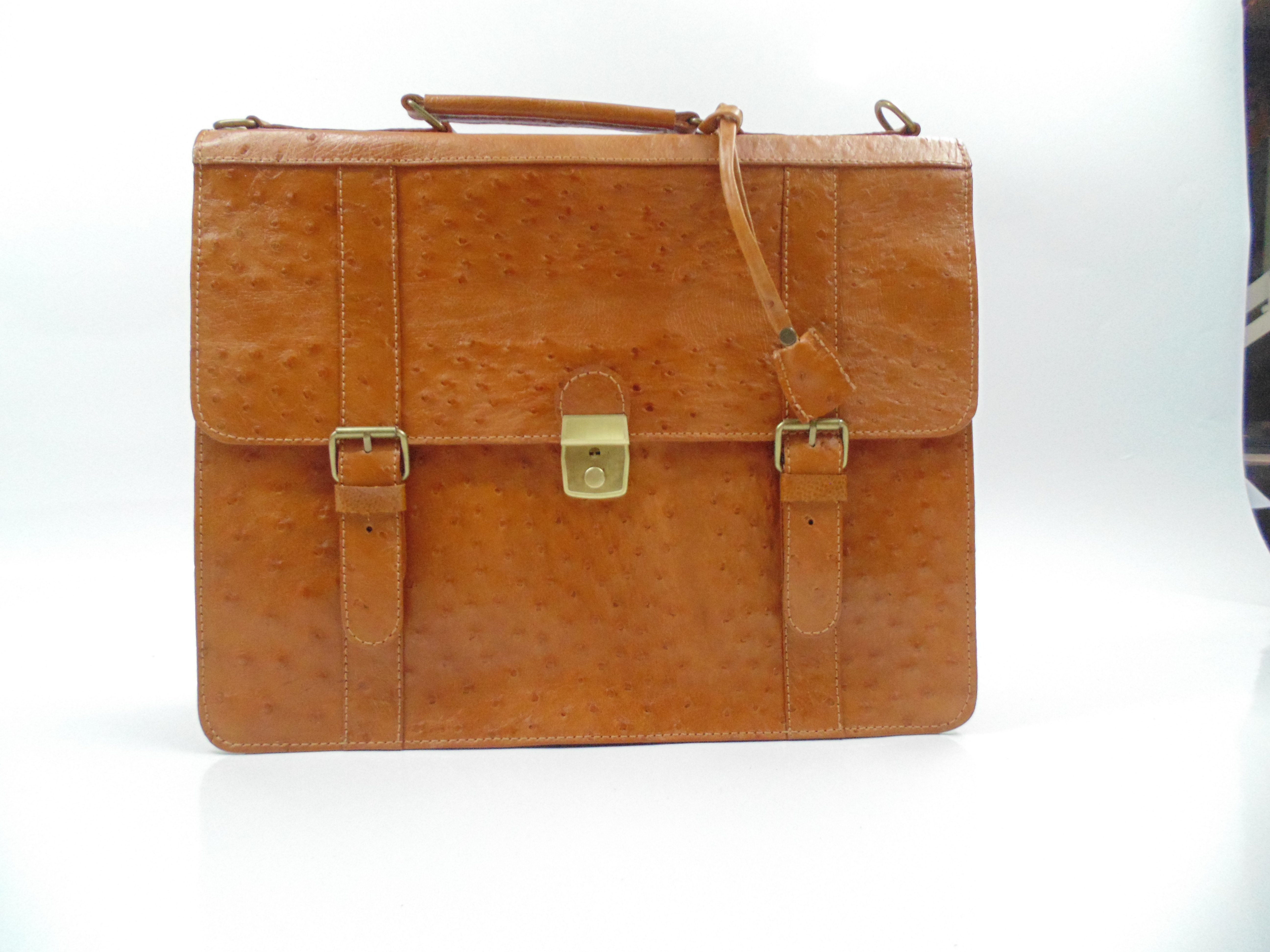 Liviano, pero resistente maletín en piel de avestruz, con amplios compartimientos interiores, cinco divisiones, dos con cierre , correa para colgar desde hombro y manilla para mano, forro interior de cuero, correas de adorno con broches y cerradura con llave.
